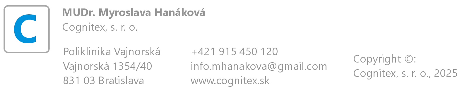 Psychiatrická ambulancia Cognitex, s. r. o., je poskytovateľom zdravotnej starostlivosti s povolením Bratislavského samosprávneho kraja.
