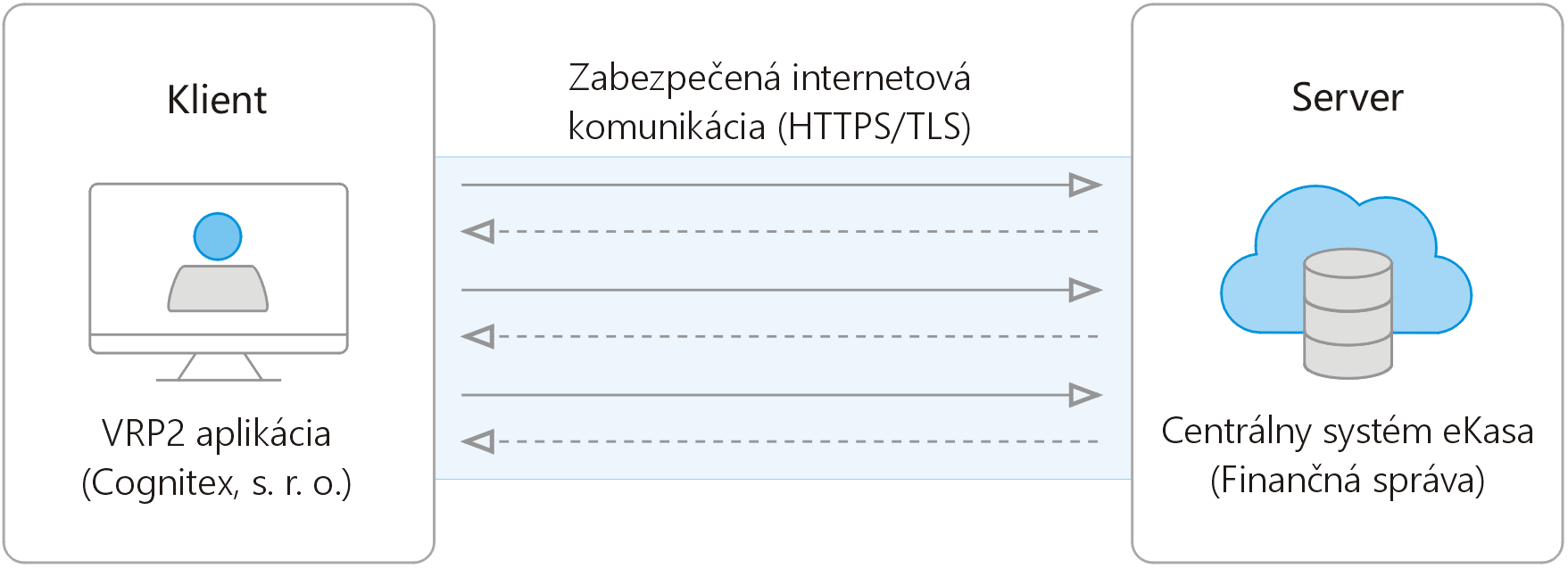 Z technického pohľadu ide o distribuovanú, šifrovanú a asynchrónne spracúvanú výmenu dátových správ medzi uvedenými komponentmi vo viacvrstvovom komunikačnom modeli klient-server. Na realizáciu komunikácie medzi aplikáciou VRP2 a centrálnym systémom eKasa je potrebné stabilné a zabezpečené internetové pripojenie (s využitím protokolov HTTPS/TLS). Je to spôsobené tým, že aj keď aplikácia VRP2 spracúva lokálne klientske výpočty, kryptografická transformácia dátových správ, ich transfer, kontrola pôvodu a integrity, ako aj ďalšie operácie sú uskutočňované distribuovane, teda na diaľku (obr. 1).