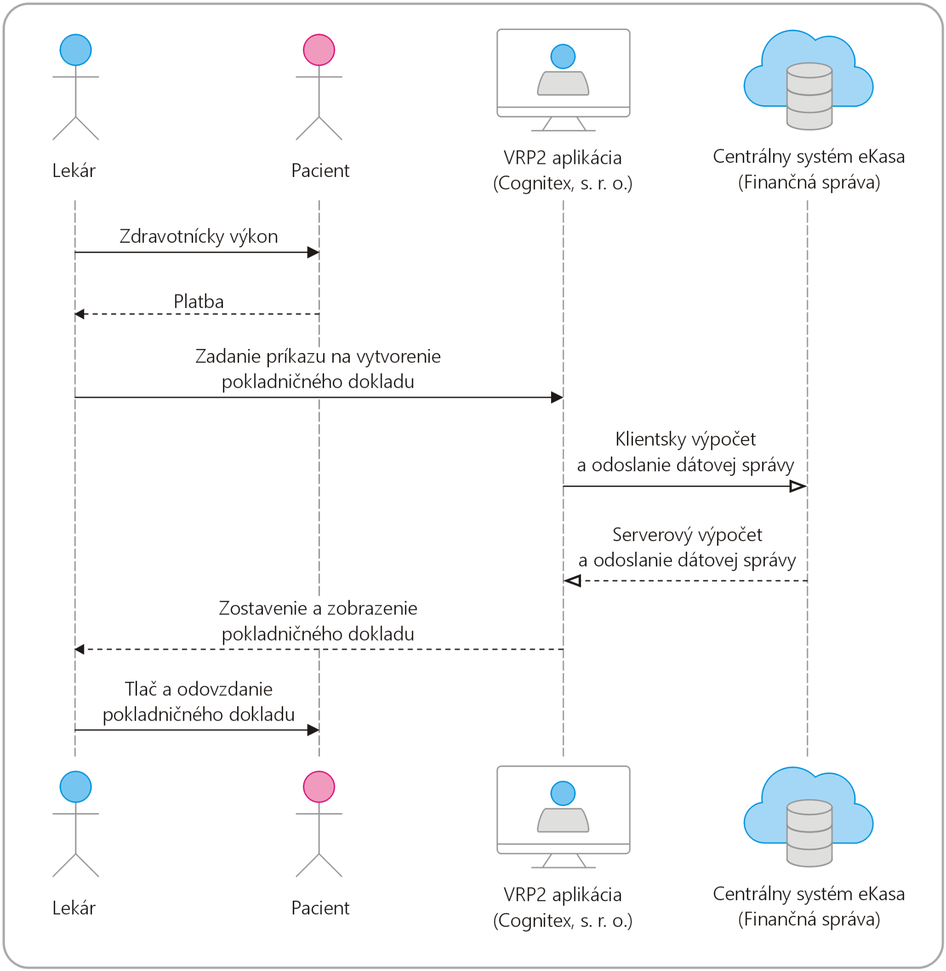 Pracovný postup, dokumentujúci realizáciu udalostí a následných akcií, ktoré prebiehajú medzi lekárom, pacientom, virtuálnou registračnou pokladnicou VRP2 a centrálnym systémom eKasa, je znázornený prostredníctvom systémového sekvenčného diagramu deklaratívneho jazyka UML na obr. 2.