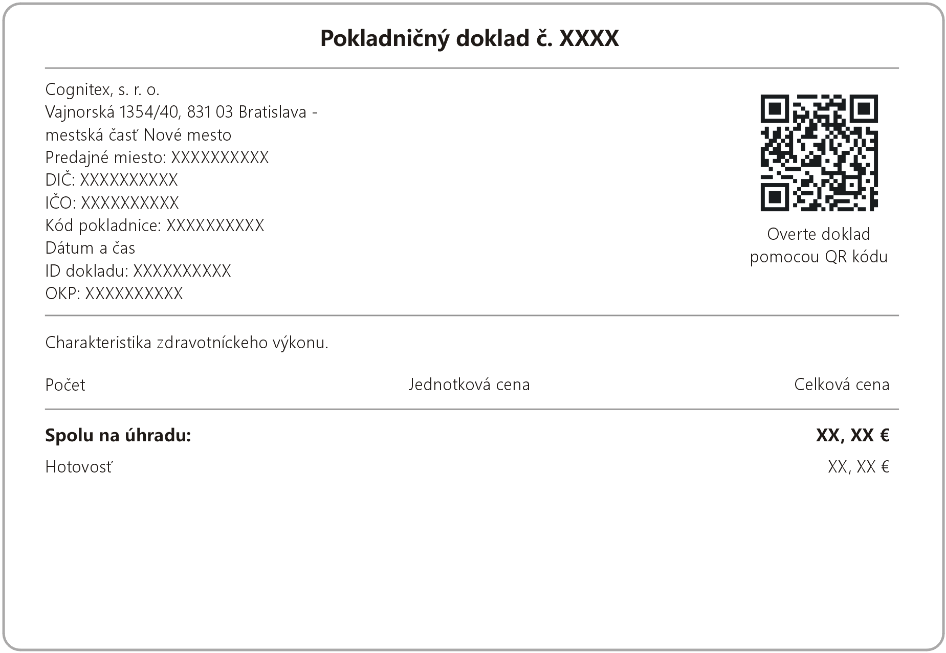 Generická podoba pokladničného dokladu, ktorý dostane každý pacient súkromnej psychiatrickej ambulancie Cognitex, s. r. o., po poskytnutí lekárskej starostlivosti v tlačenej alebo elektronickej forme, je znázornená na obr. 3.
