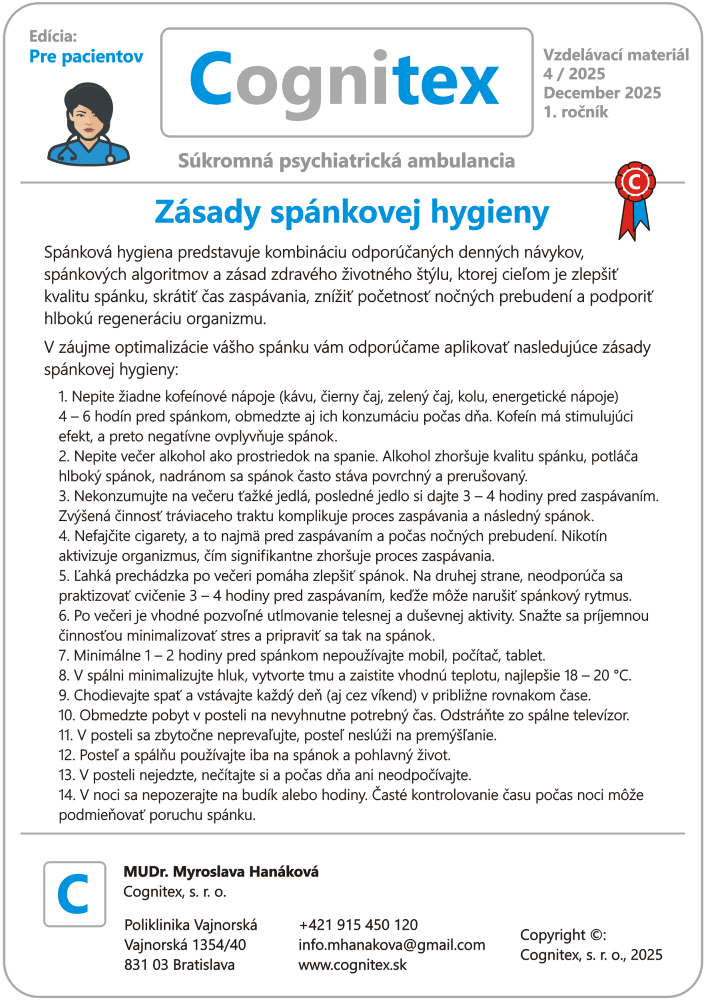 Charakteristika: Tento vzdelávací materiál zoznamuje pacientov so zásadami spánkovej hygieny.
